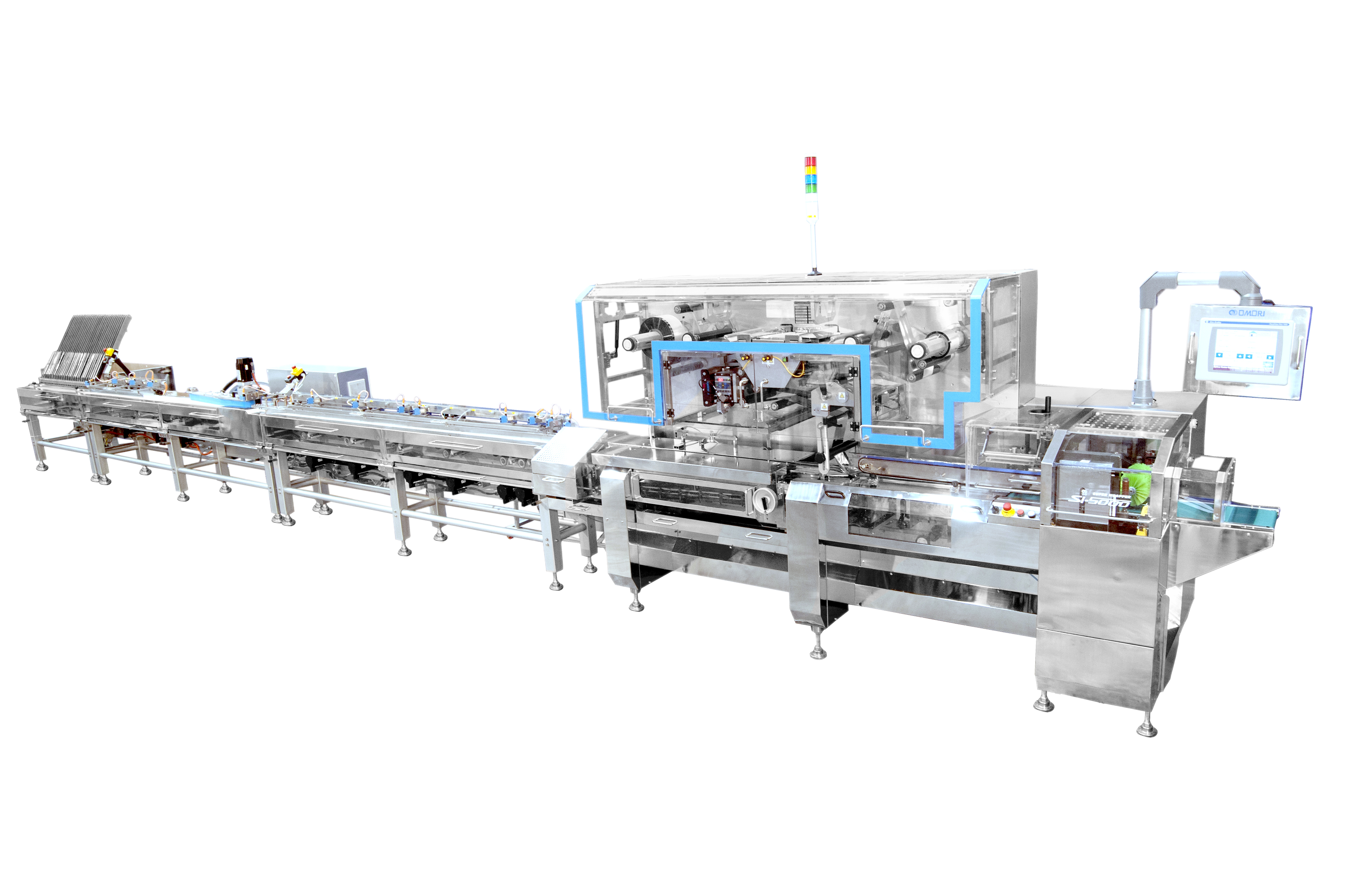 For wrapping single bars or tablets, the ‘flow wrap’ solution with ‘oblique angle feeding’ system enables a speed of up to 800+ packs per minute with cold seal wrapper provide a high degree of reliability and efficiency. It comes with optional ‘fully servo-controlled’ and ‘stainless steel’ version.